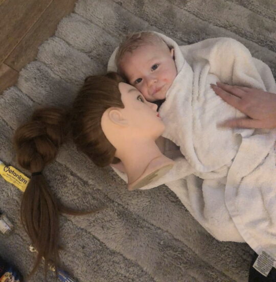 這位媽媽叫Ilarni Clark。他的寶寶Harry特別愛玩媽媽的長頭髮,從出生到現在,都要玩著媽媽的頭髮才能入睡,但由於寶寶扯頭髮的力道越來越大,因此媽媽不得已在網路上徵詢朋友意見。一位美髮師和Clark聯繫,說他那邊有顆假人頭,髮型和髮色跟Clark一樣,問問要不要用這顆「假人頭」呼籠她的寶寶:「媽媽在這裡喔快快睡,不要吵。」