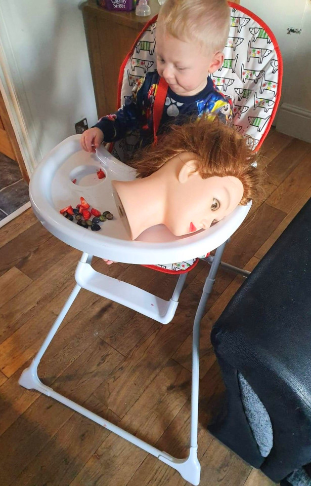 不知是好是壞,睡眠問題雖然因此解決了,但寶寶Harry卻也愛上了這個假人頭!不只睡覺要跟人頭睡,連吃飯、出門購物也都要帶著這顆人頭,著實嚇壞了不少路人。