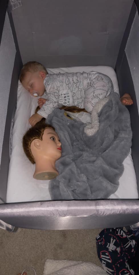 但不得否認,假人頭確實能讓媽媽Clark輕鬆許多,甚至能讓Harry自行入睡!Clark:「每次哄睡我都要推嬰兒車推半天,但那天Harry居然自己抱著人頭在沙發上睡著了!」(大驚.jpg)