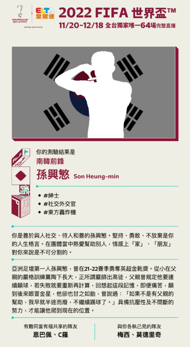 「2022世界盃心理測驗」測驗結果代表球星有萬人迷C羅、觀察家梅西、開心果內馬爾、東方轟炸機孫興慜等,另外也會有人格特質的註解,像凱恩的你充滿好奇心也具備冒險的精神、像恩巴佩的你初生之犢不畏虎,只要按部就班就能達成目標,像莫德里奇的你就算遇到挫折也不氣餒,肯努力就會收穫甜美果實!