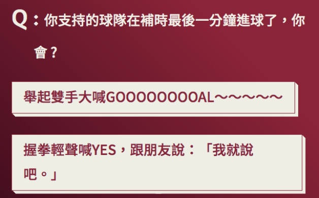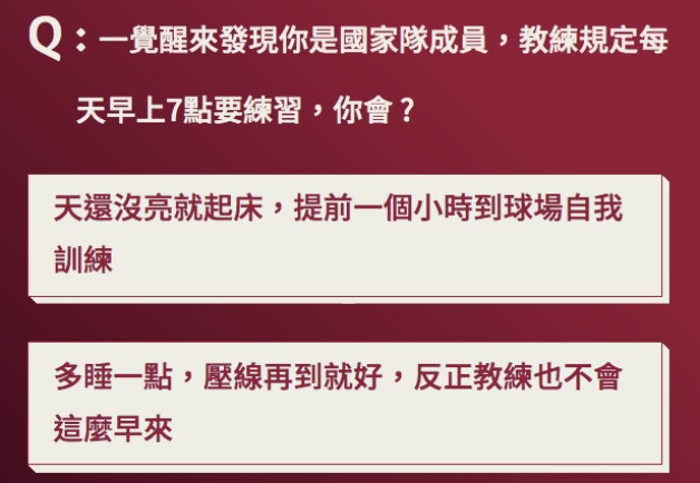 一覺起來發現自己是國家隊成員,教練規定每天七點練習,你會提前一小時到球場自我訓練,還是壓先再到就好?隔天早上要搶先發爭冠軍門票,你會委碗拒絕朋友,抑或是排除萬難赴約呢?最後一題就是爭季軍,會繼續練好練滿,還是直接享受中東風情呢?