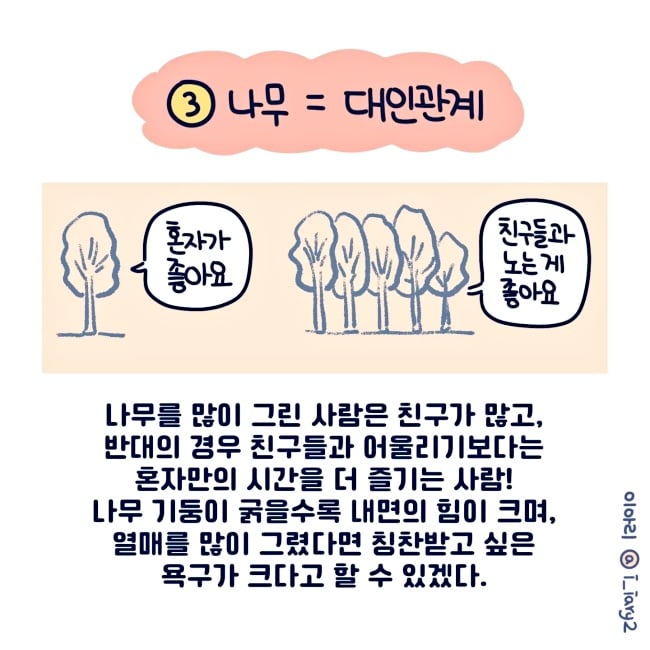 樹木的多寡直接反映出人際關係的狀況,畫出很多樹的話,代表朋友很多,相對地如果只畫出一棵樹,就表示「比起配合他人,更喜歡享受一個人的時光」,樹木的根部畫得越粗,象徵擁有強壯的內心,而在樹上畫出「果實」的話,則是有想被他人稱讚的嚮往喔!