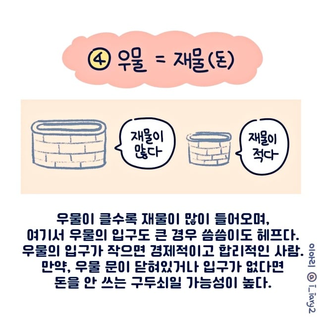 畫出的水井代表著你的「經濟狀況+理財觀」,水井越大、擁有越多財力,井口也很大的話,同時象徵開銷很大的意思,反之,如果井口小則是代表你是一個「節省、精打細算的類型」,不過如果是畫上有蓋子地井、或乾脆沒畫上井口,就是根本不太花錢的守財奴!!!(笑死)