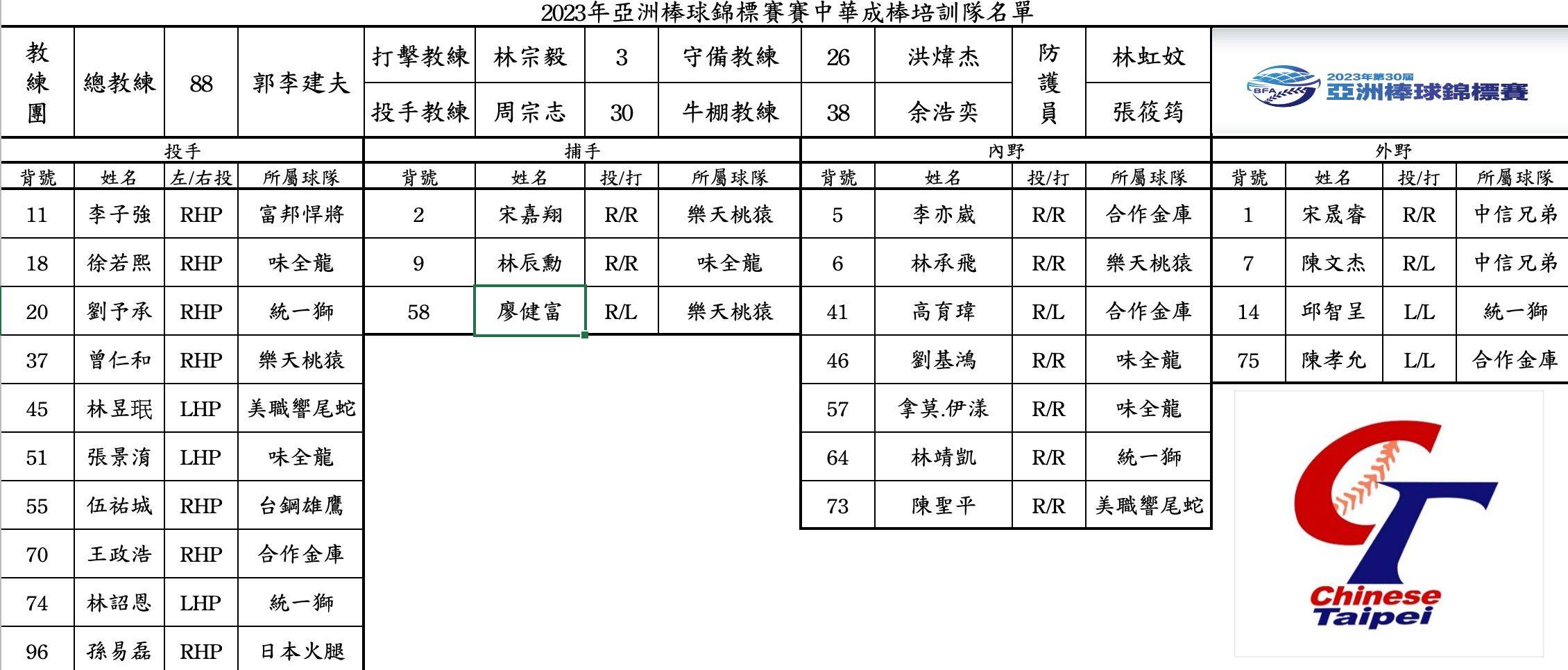 黃金陣容誕生!本屆亞錦賽由「郭李建夫」擔綱總教練,領銜投手陣容「李子強、徐若熙、劉予承、曾仁和、賴延峰、張景淯、伍祐城、王政浩、林詔恩、孫易磊」,捕手陣容「宋嘉翔、林辰勳、廖建富」,以及野手陣容「李亦崴、林承飛、高育瑋、劉基鴻、拿莫・伊漾、林靖凱、陳聖平、宋晟睿、陳文杰、邱智呈、陳孝允」共24位中職新星。