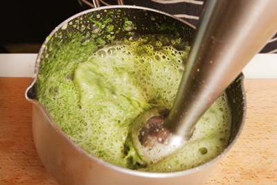1.製作菠菜醬汁,將所有材料混合,以手提式攪拌機打至滑順。再將菠菜泥放入醬汁鍋內大火煮至濃稠,以海鹽與黑胡椒(材料外)調味。
