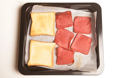 2. 將吐司與黑胡椒牛肉火腿以攝氏170度烤25分鐘至火腿乾脆、吐司金黃即可備用。