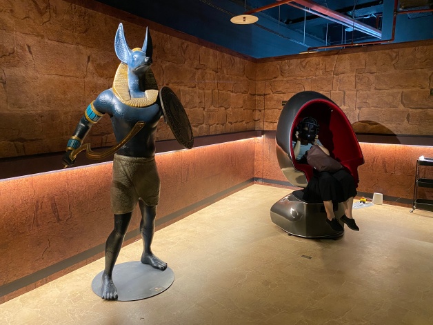 「VR體驗」採用最新3D技術,藉由Voyager動態椅,帶領妞妞們深入探索圖坦卡門的威嚴和神秘,虛擬實境體驗取得埃及政府許可,在圖坦卡門實際墓穴中進行,同時也有獨家近拍,大量捕捉古老文物和場景,超級像柯南《貝克街的亡靈》的繭啊!