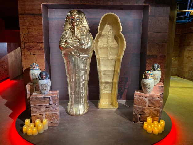 看完重現木乃伊化儀式之後,妞妞們也能化身「木乃伊」(?),展區中有仿圖坦卡門純金棺材,一旁還有許多陪葬品啊!