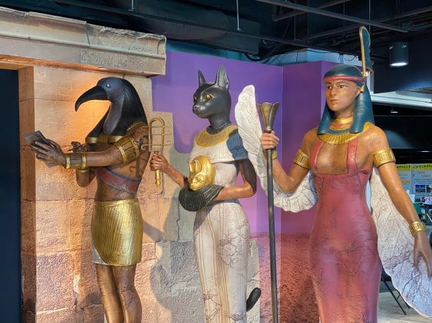 入口處會有六座大型「古埃及神像」,像是雨神「泰芙努特」、生育之神「伊西斯」、戰爭之神「賽特」,還有大家所熟知的有著胡狼頭人身的「阿努比斯」,同時也是製做木乃伊的神,象徵死神!