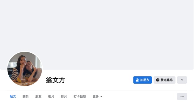 方方正正「翁文方」,臉書簡介只顯示「現居新北市」和「來自新北市」,沒有任何一則發文和好友(?),但個人頭貼放了跟伴侶朱儷雅頭靠頭的超甜閃照!(戴墨鏡)