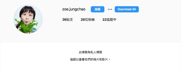 除了趙蓉之的Facebook之外,Zoe之前跟張亞靜用「Anna」假名DM聊天的私人IG也被網友發現,ID很簡單就是「zoe.jungchao」,不過目前是私人帳號!