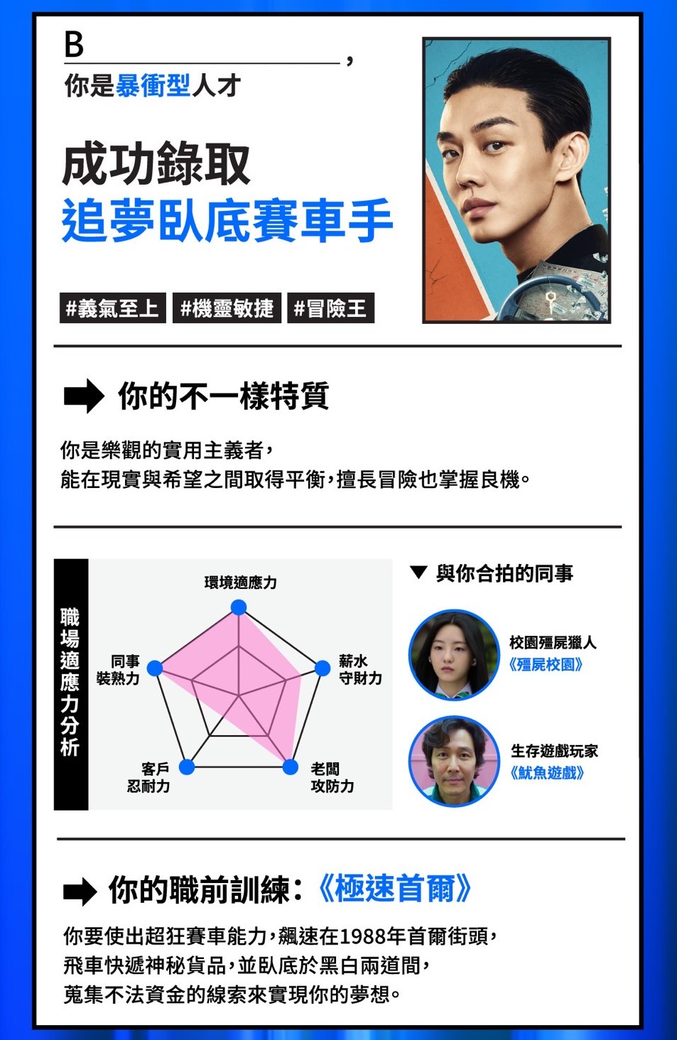 測驗結果除了顯示你是哪種人才以外,還會說明屬於你不一樣的特質、職場適應力分析,以及提前幫你過濾好合拍的同事可能會是哪一些,最後也依照特質安排適合你的職前訓練,完全就是佛心公司嘛(嗯?XD)。