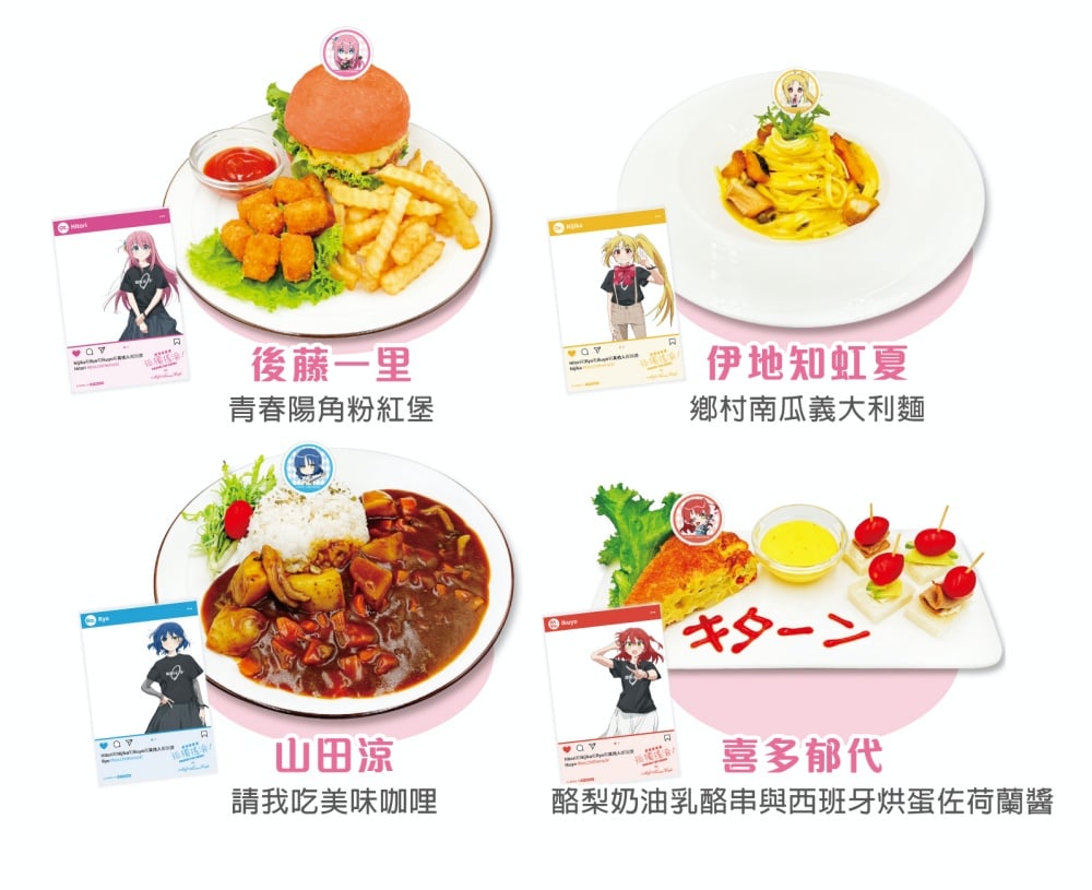 本次咖啡廳內特別祭出以動畫情節為發想的鹹食主餐,包含後藤一里「青春陽角粉紅堡」、伊地知虹夏「鄉村南瓜義大利麵」、山田涼「讓我吃美味咖哩」、喜多郁代「酪梨奶油乳酪串與西班牙烘蛋佐荷蘭醬」。享用主餐即會贈送對應的角色SNS風透卡,肯定要吃爆!