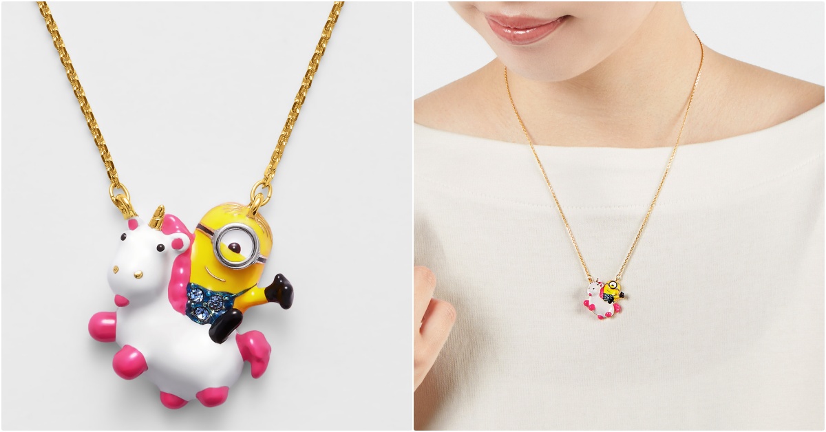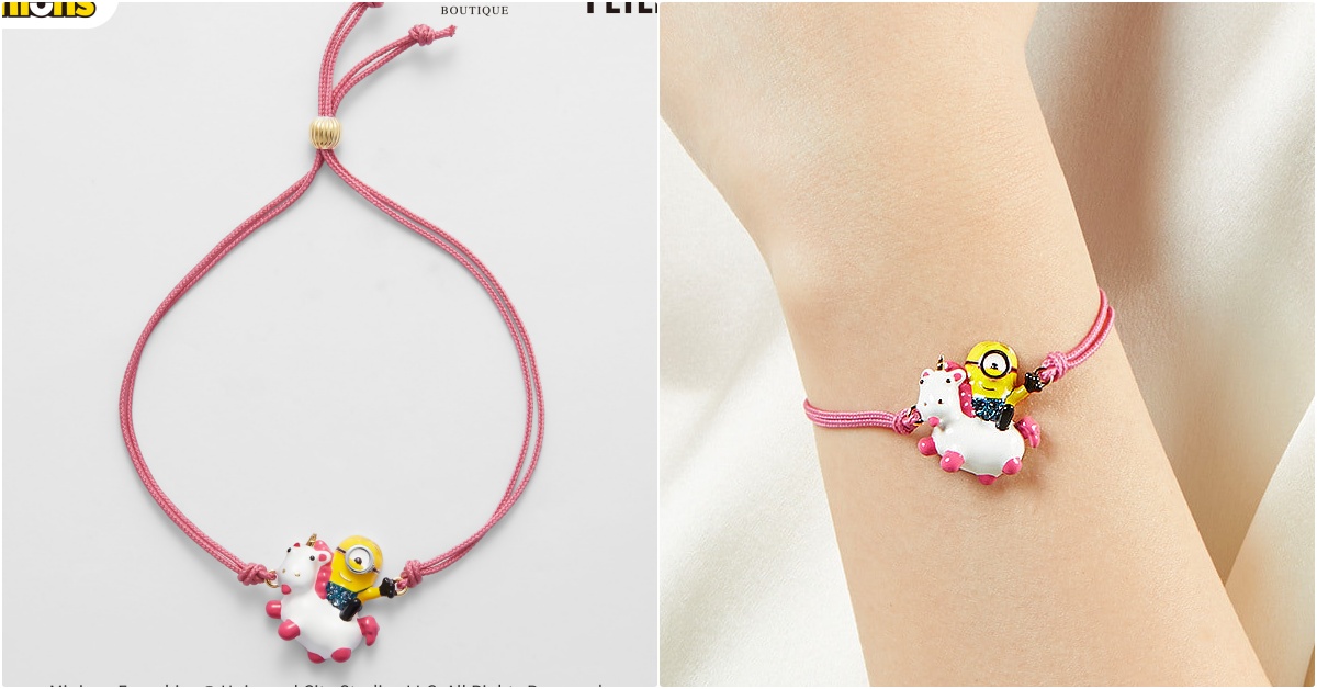 神偷奶爸超級惡棍格魯小女兒安安夢想中的迷幻生物「獨角獸」,居然被史都華找到了!只用鍍金、鍍銀、玻璃材質精緻還原「史都華開心騎著獨角獸」的造型,成為聯名項鍊、手環以及戒指的重點設計,手鍊採用粉紅色細繩搭配,戒指則是裝飾「粉鑽星星」呼應粉、白配色的獨角獸,少女心爆發~