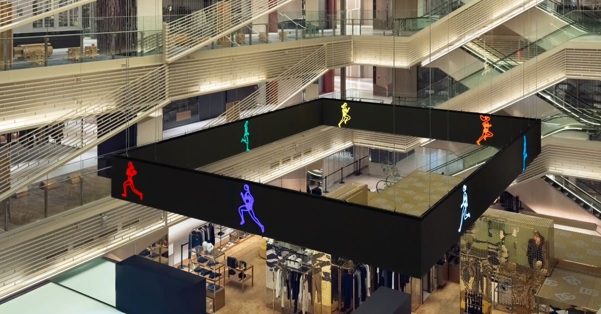 作品從 2025 年 9 月起亮相於中庭,以 LED 光影打造多位女性跑者的「奔跑姿態」。