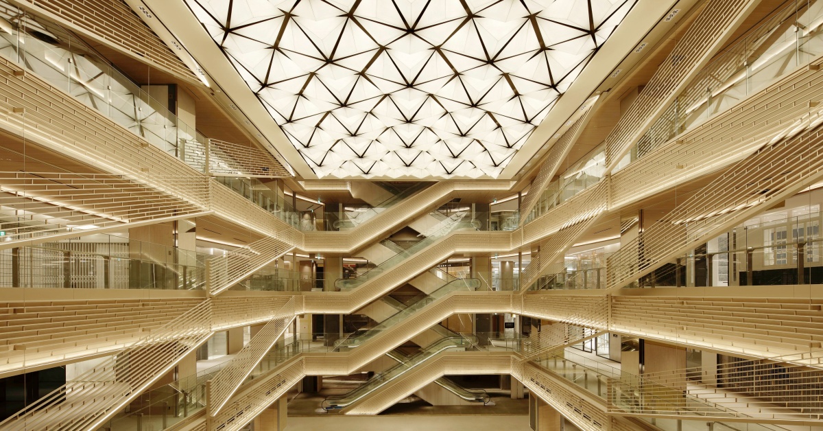 這件作品最迷人的地方是——你不需要停下腳步,也能「看見藝術」。無論是站在一樓中庭抬頭仰望,搭乘手扶梯隨著高度緩緩上升,或站在高樓層迴廊往下俯看,每個角度都能看到不同的畫面變化。