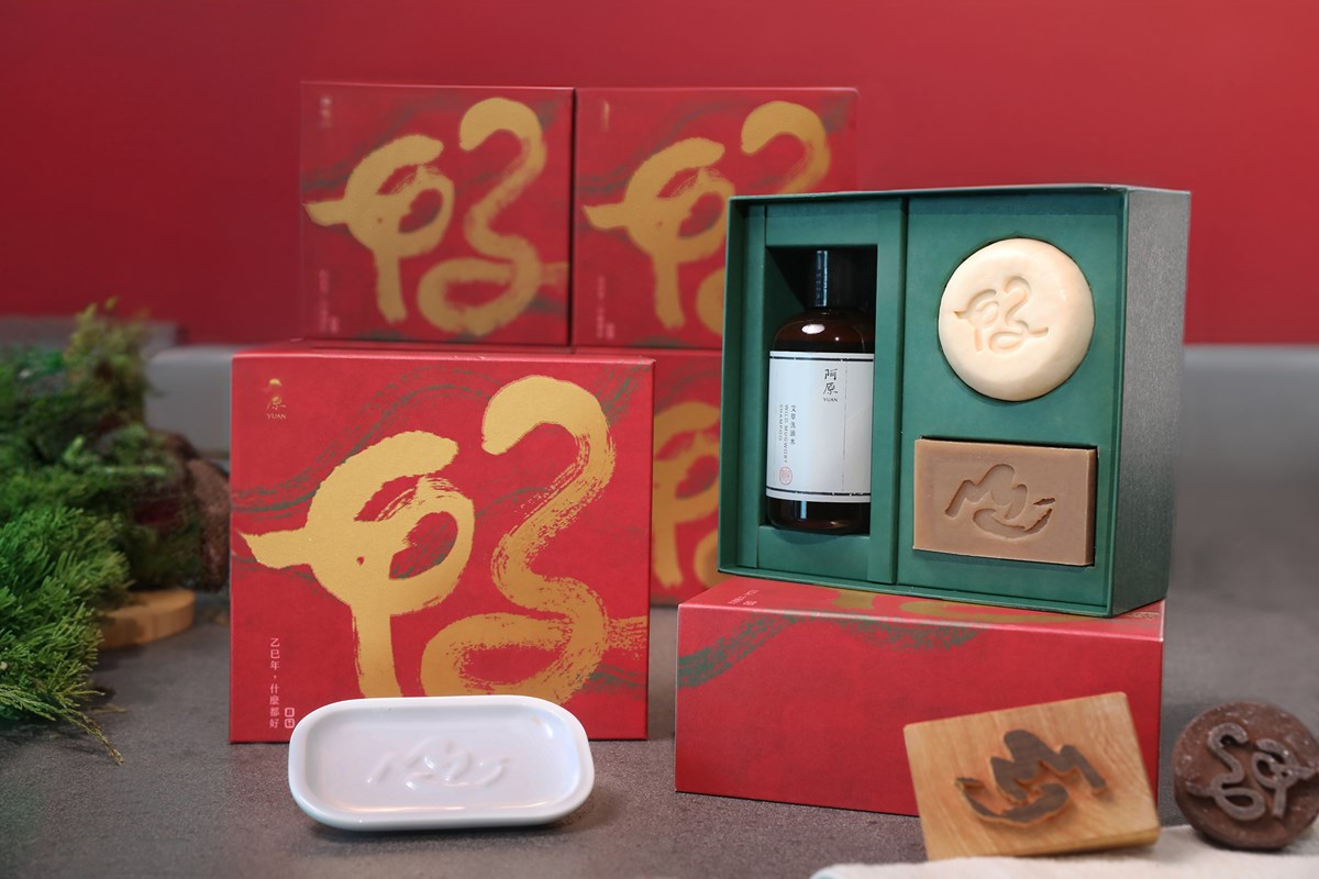 「什麼都好-鴻運當頭」禮盒的名稱與設計可謂別具匠心,靈感來自乙巳年的蛇年諧音,結合品牌「好山好水」的自然意象,將祝福融入皂章的「好山水」設計之中,外盒金色「好」字以書法撰寫,展現阿原文字力。「鴻運當頭」寓意新年吉祥好運,與禮盒中核心產品艾草洗頭水有深刻聯結,洗去過往煩惱,昂首迎向好運。