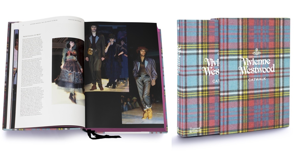 此外,Vivienne Westwood Catwalk 一書的裝幀設計也別具巧思,書皮上粉紅色及藍色交錯的格紋呢是以 Vivienne Wesrwood 於 1993 年秋冬名為 Anglomania 的系列服裝為靈感,更也象徵著法國人對英國事物的熱愛,同時也是對 Vivienne 女士的丈夫兼設計夥伴的詼諧讚揚。註:格子呢由蘇格蘭的 Lochcarron 織造,且經蘇格蘭格紋註冊協會的官方認可