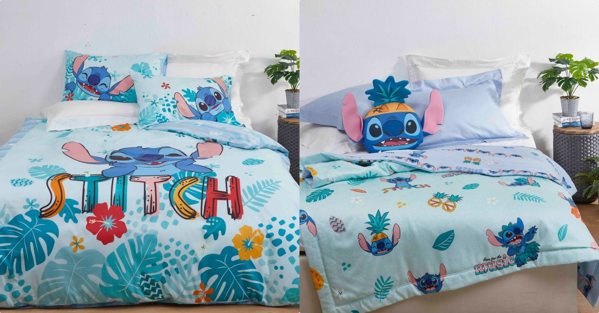 首先要介紹的當然是本次的寢具系列,左邊超Chill的是「純棉床被四件組」,手感舒適又充滿光澤,上面有著充滿夏威夷風情的扶桑花,連枕頭上史迪奇的表情都做得相當精緻。而右邊清涼藍色系則是「木棉絲涼被」,觸感柔軟又冰冰涼涼,非常適合現在悶熱的夏天!(一秒到夏威夷啦!)