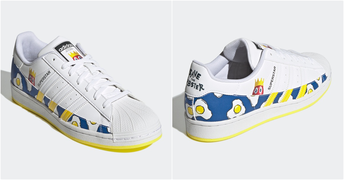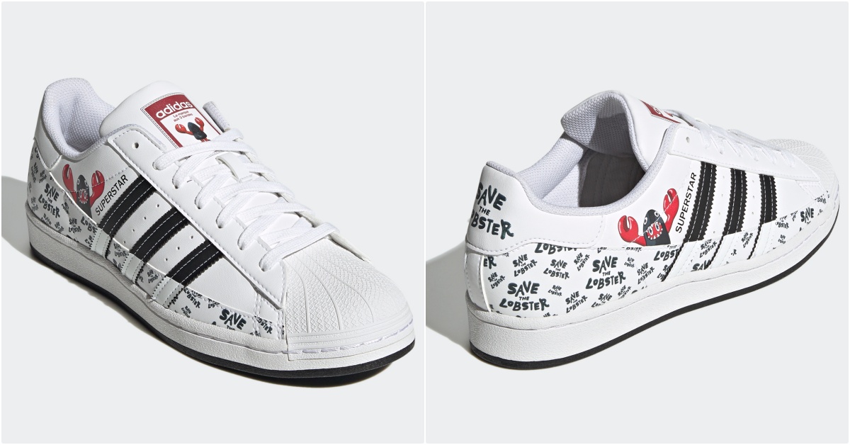 經典Superstar當然也被荷包蛋、龍蝦佔據(笑),「龍蝦貝殼鞋」黑、白兩色為主色,一隻龍蝦霸道的出現在三條槓槓旁邊,鞋面上也點綴SAVE THE LOBSTER的字樣,不會過於高調。