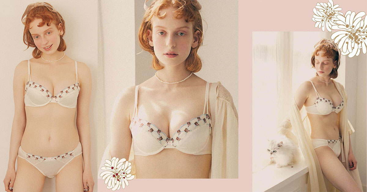 Peasy貓咪無痕細肩帶無鋼圈內衣/NT$890 貓咪蕾絲內褲/NT$490