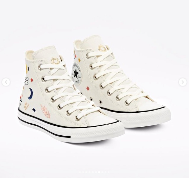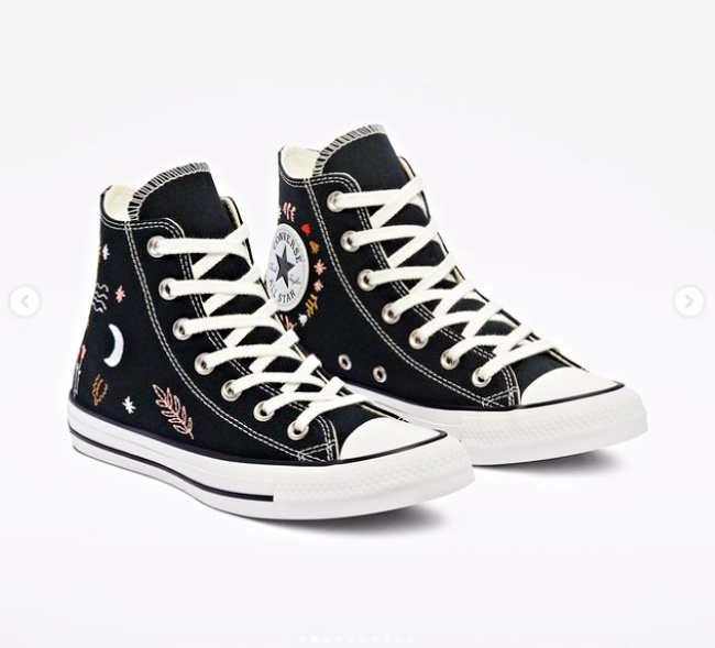 萬年基本款CONVERSE的「CHUCK 70帆布鞋」居然開花了(笑)?一束束繽紛花朵、星辰、植物、月亮等圖騰,精緻繡上黑、白配色的鞋身,黑色款特別在LOGO外圍繞一圈可愛繡花,白色款式則是隨性點綴,在鞋舌後還藏有溫暖訊息:「It's okay to wander from yourself to the world」,以上「春日小花鞋」快列入清單~