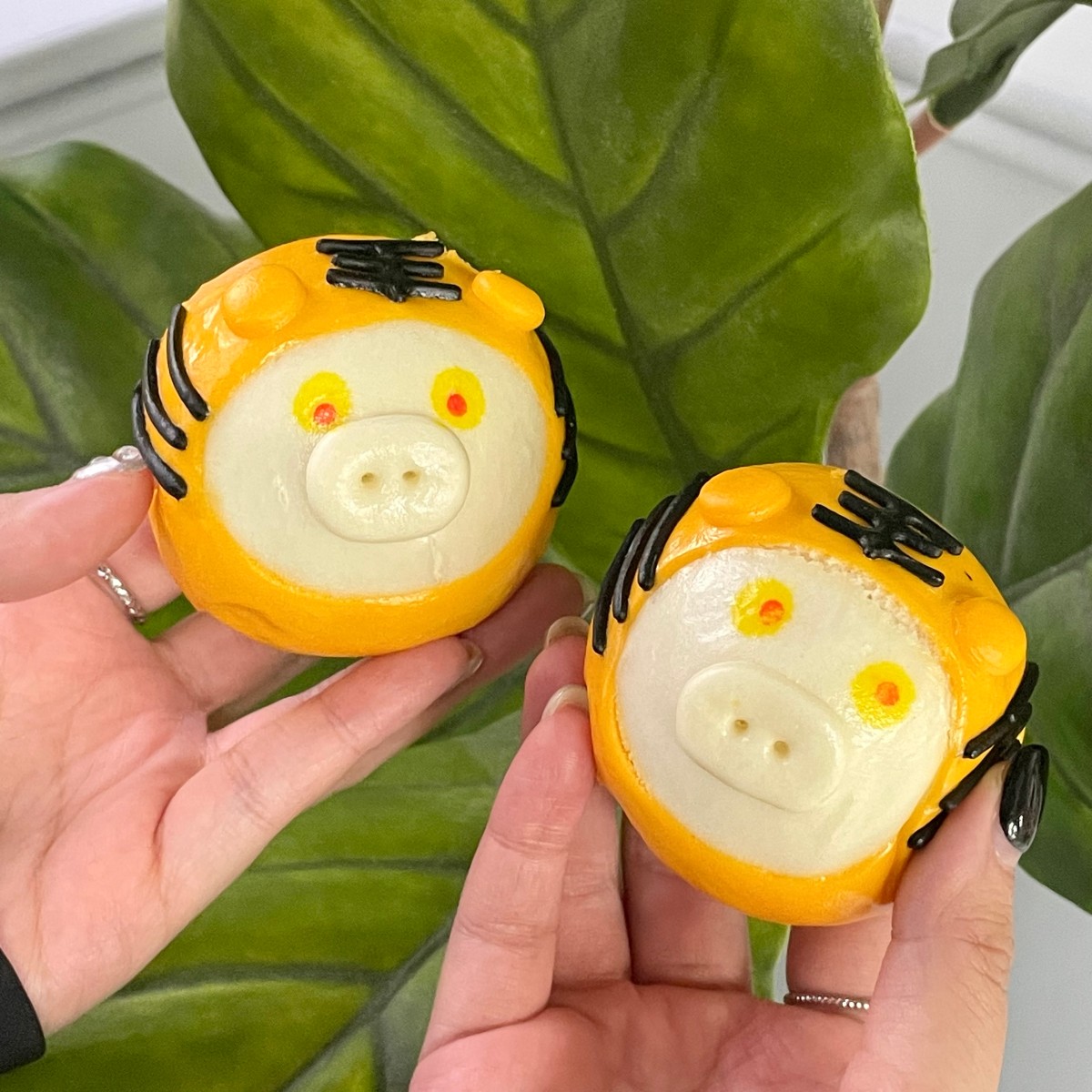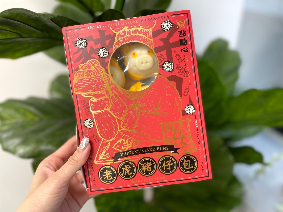 港點專賣店點點心讓人氣餐點「豬仔包」應景換裝,變身成限定版「虎豬」,加熱後戳戳它的鼻孔,流沙內餡就會超犯規地湧出,既可愛又美味!除了本體之外,包裝盒也特地以喜氣紅呈現,從外到裡都充滿著巧思。