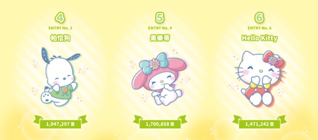第四到六名2021年也在榜單上,第四名為去年第三名的「帕恰狗」(幫哭),原本第四名的「美樂蒂」名次倒退一名變成第五名,「Hello Kitty」排行則持平為第六名!