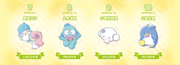 第7名至第10名分別是「雙星仙子」、「人魚漢頓」、「小麥粉精靈」和「山姆企鵝」,其中雙星仙子、小麥粉精靈和小麥粉精靈跟去年一樣都在前十名之內,搖滾少女「SHOW BY ROCK」掉出榜單(第十四名),「人魚漢頓」則是首次入榜,他是出生於中國的半魚人,最愛吃涼麵和蝦味仙貝!