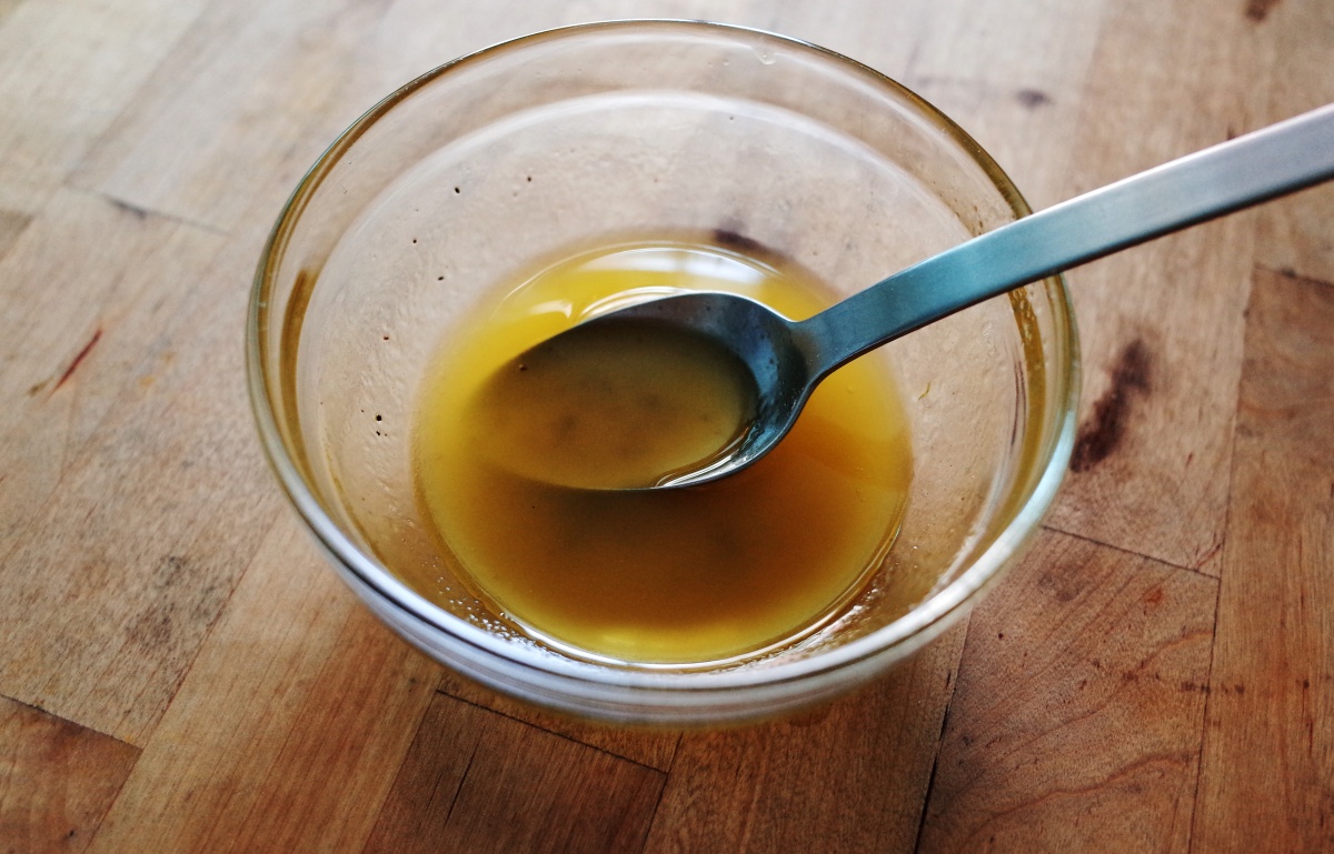 2.橄欖油與檸檬汁、蜂蜜用湯匙快速攪拌,醬汁乳化後,加入海鹽、黑胡椒調味備用。
