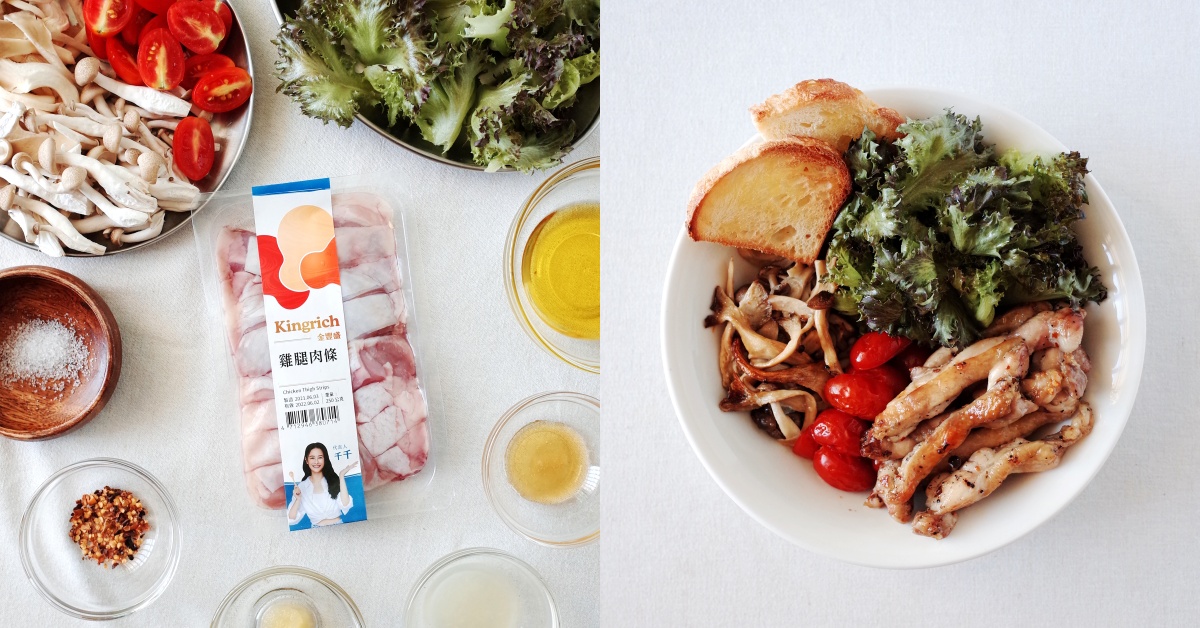 食材:金豐盛雞腿肉條1盒、蒜泥15g、海鹽0.5小匙、黑胡椒1小撮、乾辣椒碎片1小撮、綜合菇類100g,剝成適口大小、小番茄8顆,洗淨對半切生菜適量,洗淨瀝乾、橄欖油2大匙