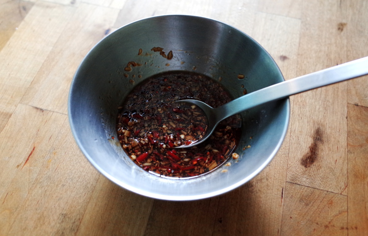 醬汁:醬油15g、蠔油10g、味醂15g、蒜末10g、薑末5g、辣椒末10g、香油1小匙