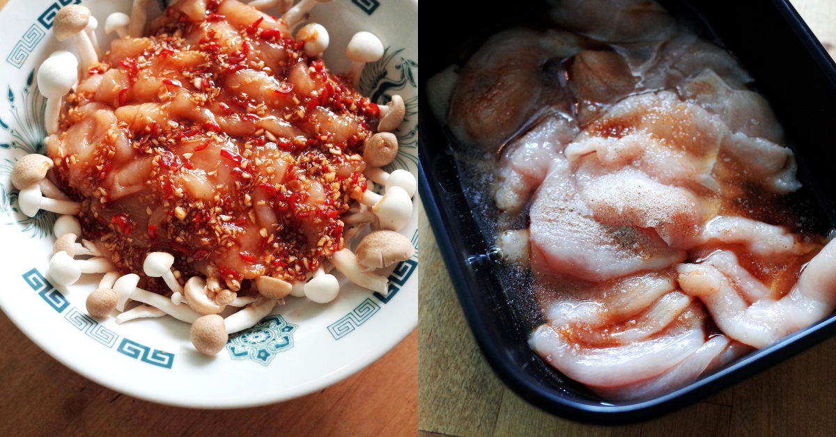 食材:雞胸肉片1盒、綜合菇類100g,剝開(鴻禧菇+雪白菇)、鹽0.5 小匙、醬油 1小匙、生飲水1大匙、米酒1大匙、白胡椒1小撮、太白粉1小匙、蔥花10g