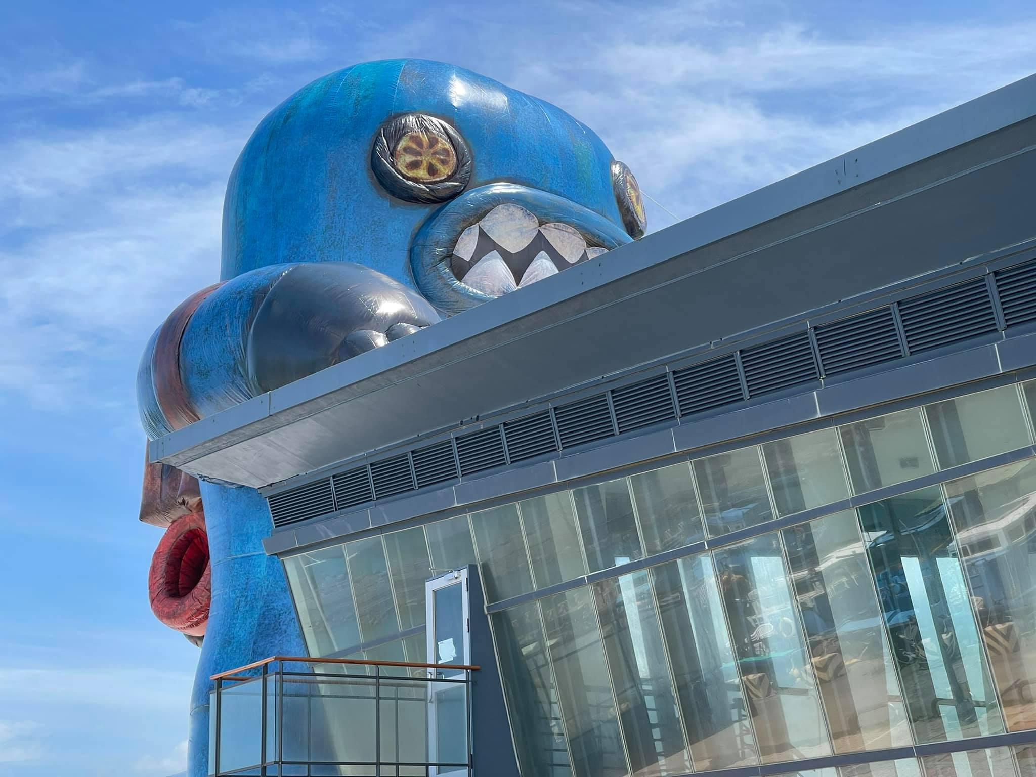 而「春江獸月夜-阿咧特展」是看海美術館的首場展覽,本次展覽最吸睛的一件作品,就是這次特展的主角「春江獸」,有14米這麼高!高聳的怪獸背著背包雙手環抱看海美術館,從遠處看就超級壯觀~妞妞們要登上三樓才能看到怪獸的正面喔。