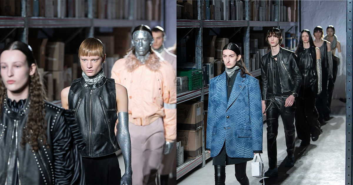 同樣的實用主義精神也體現在眾多作品:粗獷的牛仔卡車司機夾克,衣身運用四孔紐扣細節,與傳統工裝如出一轍;兩件式設計和手鐲以刷舊效果的小牛皮打造,厚底德比鞋採用復古風格鞋頭,創意十足的設計無不起品牌愛好者的目光。伴隨著模特在秀場上演繹不同造型,正創造無限可能:在幽暗空間彌漫秋天落葉氣息,微光漸亮,宛如瞬間置身於夜晚森林中的篝火旁,享受著與友人的愜意時光。縱觀其中,本季成衣系列標誌著MM6 Maison Margiela運用獨特視角審視,以沉著態度帶來全新禮讚。品牌重新聚焦經典:英文單字SIX Logo點綴皮革背心,學院風外套也妝點相同的花色,圖案周圍繞品牌標誌性「銜尾蛇」的古老圖騰;描繪出吞食自身尾巴的蛇形輪廓,象徵著永恆不斷的正向循環,也依此樣式打造仿舊的金屬紐扣。