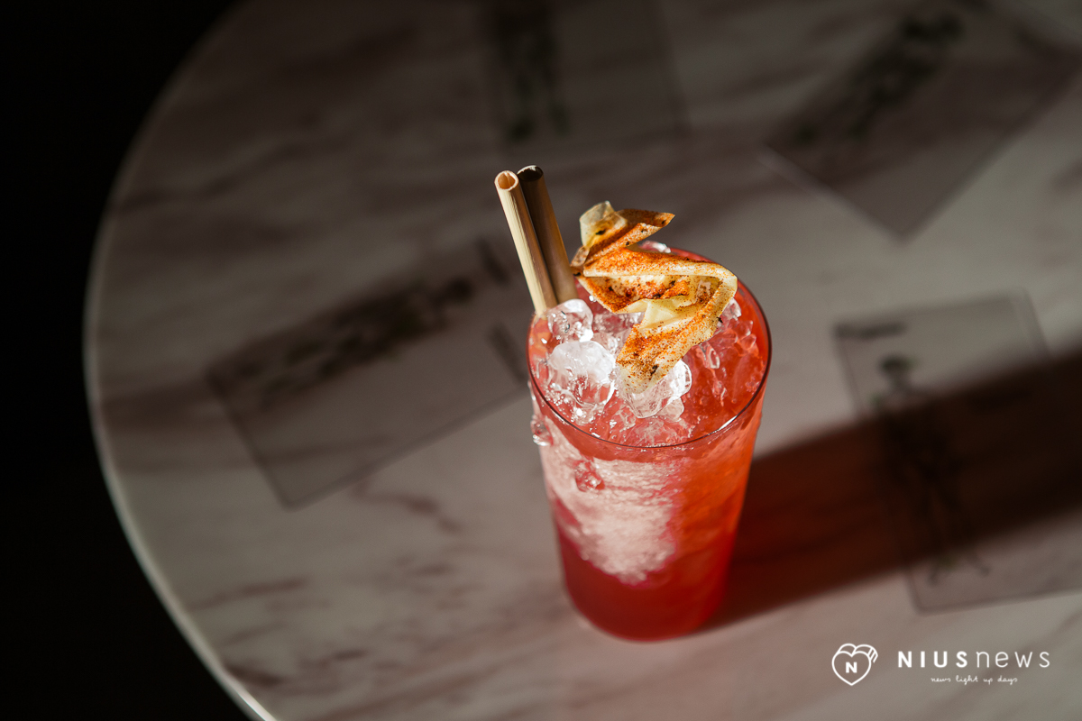 妞妞記得叻沙葉的味道嗎?這杯酒就是以南洋料理為發想,將叻沙葉舒肥進蘭姆酒之中,中間還能喝到鳳梨和萊姆的酸甜滋味,尾端會有淡淡的義式草本的香氣,上頭搭配的紅椒豆皮更是有趣,油脂會帶出叻沙的味道,妞妞們可以先吃豆皮再喝酒,鹹香的口感能嚐到調酒完全不一樣的風味呢~