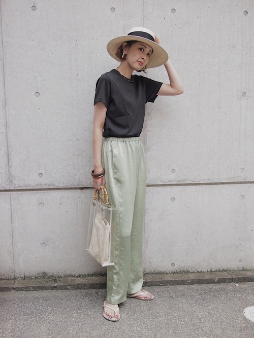 淺綠色亮面的寬褲其實一沒穿好會看起來很像睡衣,想要搭配T恤穿的話,一定要用配件讓睡衣感不要這麼明顯。像是這位妞妞就用手環、耳環、項鍊和草帽,再拿個竹節提把的透明包,看起來就很時髦。