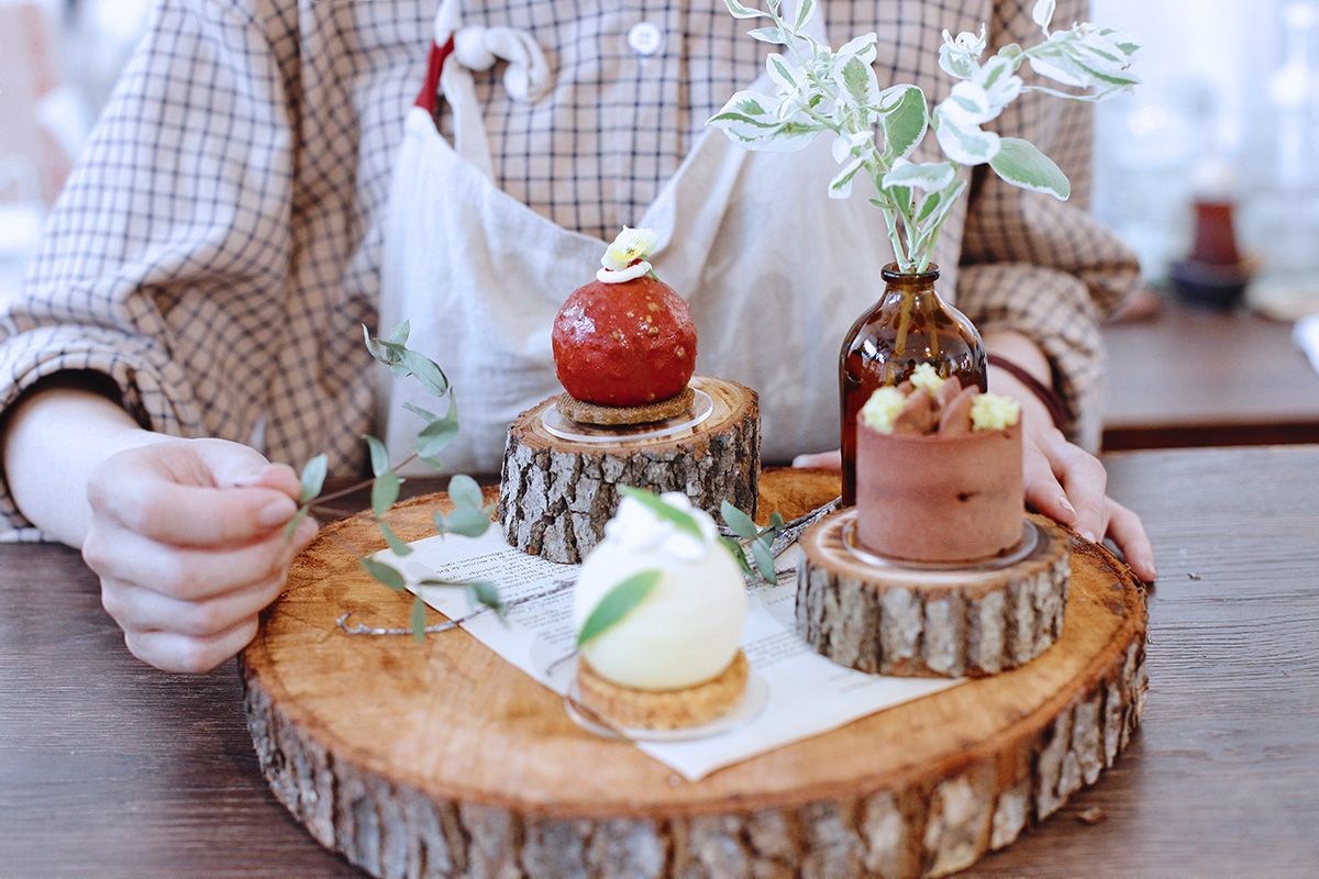而第二款「晨曦」內餡則含有蜂蜜慕斯、日本天然糖漬黃檸檬皮丁等,最下層還搭有鹽之花堅果酥餅,嚐起來既綿密又有餅乾的酥脆,酸甜滋味嚐過一定會愛上;最後一款「草木」使用法國Weiss 63%巧克力慕斯及100%可可杏仁蛋糕,再搭以黑李酸櫻桃果粒餡與開心果分子蛋糕。現代人吃到飽的習慣變成是「用食物來喂自己」而不是真正「品嚐食物」,這份「小滿拼盤」就是想讓顧客回到最原始味覺上的「品」。(小滿拼盤販售至6月7日,未來還會推出其它限定商品,妞妞們好好期待一下吧!)