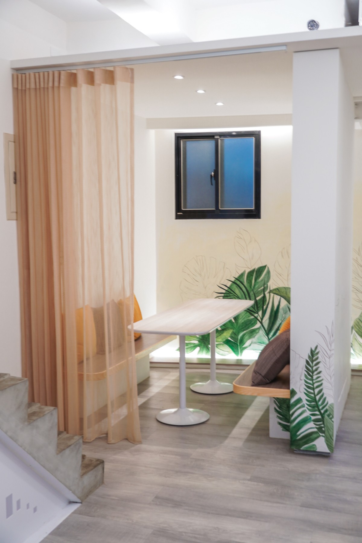 例如利用樓梯邊邊的角落,規劃出一個小包廂的座位區,滿適合鄰近上班族過來用餐加談生意。