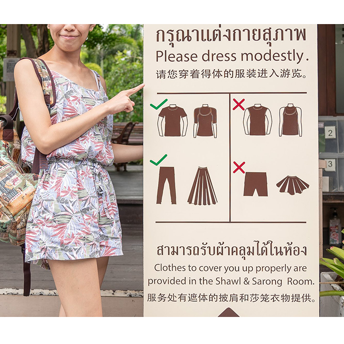 穿著上也要注意,短褲是不行進去的(親身示範不得體的服裝)