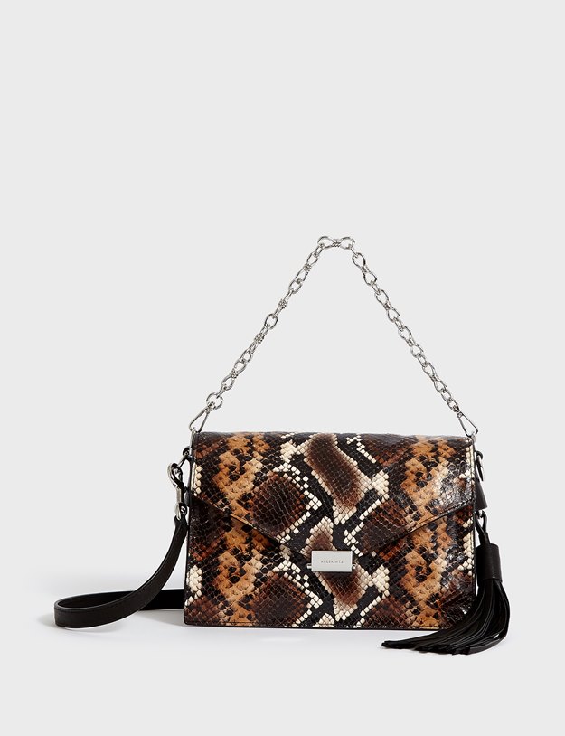 AllSaints秋冬系列推出兩款全新包款 - Miki與Polly系列。Miki系列採用柔軟羊皮製成,搭配可拆卸流蘇和金屬鏈條細節設計,同款更推出多色選擇,包含經典百搭的黑色、復古情懷的駝色,與特殊蛇紋壓紋印花,多變百搭。