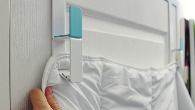 先將被單開口朝下,並用彈簧夾把被單上的兩角夾住,再將下端的兩角抓起往上勾,棉被同樣以彈簧夾夾住,再蓋起來就大功告成了!