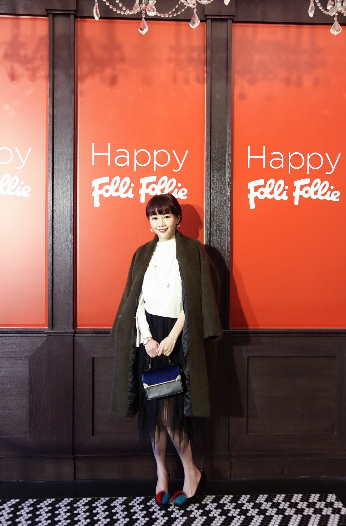 參加派對時,浿機推薦女生都很喜歡的玫瑰金配件,像這款Folli Follie Wonderfly蝴蝶結元素的系列,不用複雜,在細節上就有浪漫的感覺。在秋冬包款上,浿機表示:「Folli Follie的MISS FF系列使用天鵝絨材質,讓包包的質感更好,很有冬天的感覺,深藍色包款搭配今天的黑白穿搭就會有點跳。」