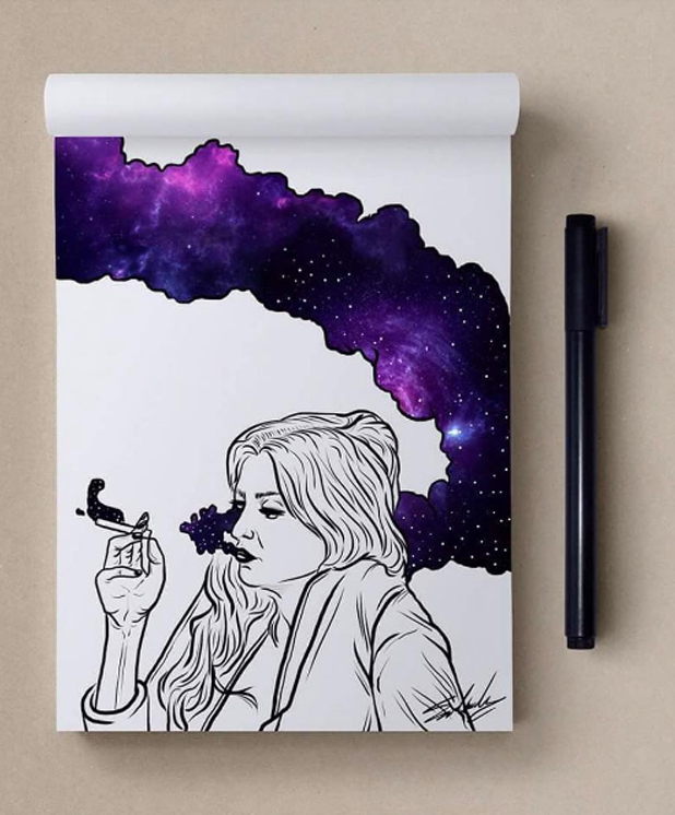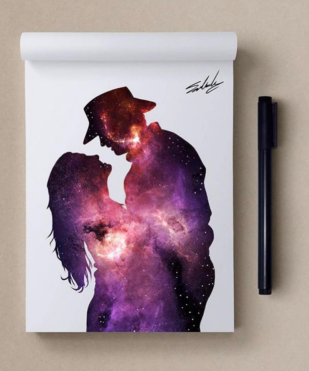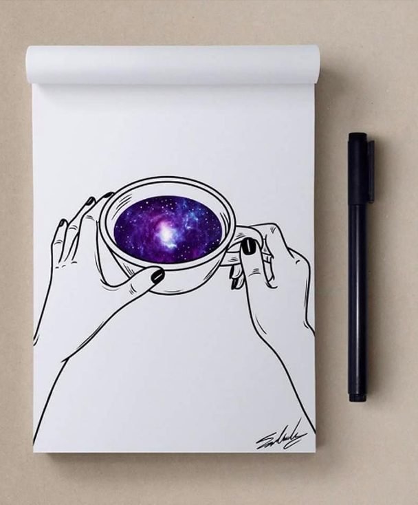 Muhammed Salah的畫作比較偏向靜態,看久了有一種說不出的寧靜感,雖然大部分都以黑白線稿為主,並用星空圖加以點綴,但每幅的主題都很特別,也非常有意境。想看更多Muhammed Salah作品可以點我發摟他喔!