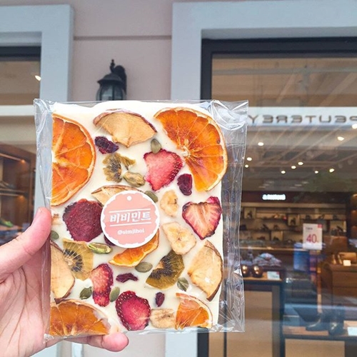 首先就是這家BBMINT(비비민트 ),製作時先把五顏六色的水果切片烘乾之後,再放入不同的口味的巧克力片當中,吃起來不會只有巧克力的死甜,還有水果的清香,可以說是甜點和水果擦出來的全新火花啊!