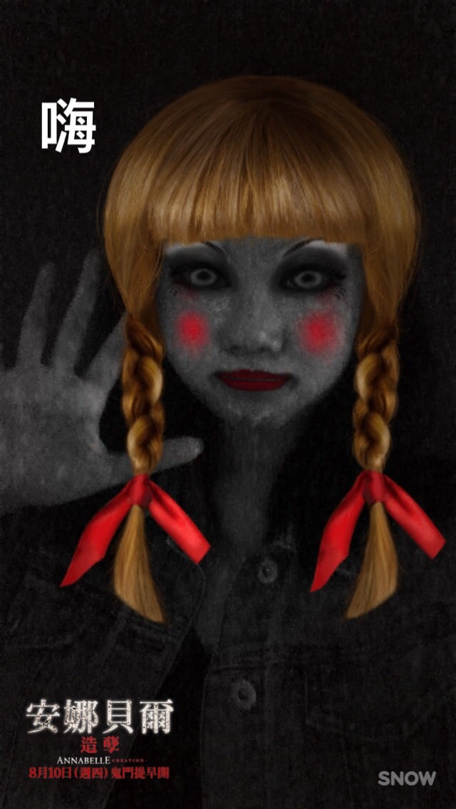 這次,Snow更搭上《安娜貝爾:造孽》的浪潮,推出了「亡美專屬」的特效~不只網美愛用、亡美更愛用!Snow這麼貼心,相信我們來自好萊塢的巨星小貝,也一定深受感動,會在台灣盡情造孽的!
