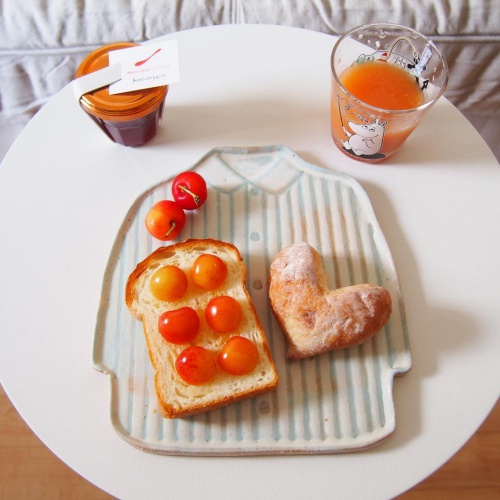 番茄與吐司的極簡組合就配上一件藍白相間的直條紋襯衫,簡單俐落。