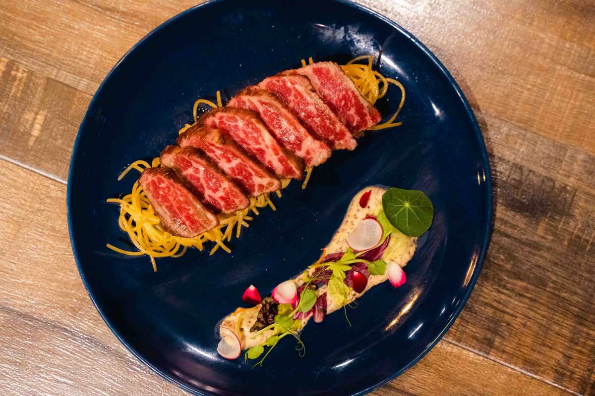 「芥香板腱嫩牛義大利麵」是清炒型義大利麵,上頭的精選牛板腱厚切1公分,油花分布均勻,七分熟的熟度讓肉質富有嚼勁;麵條Q彈不會一扯就斷,搭配旁邊的芥末籽沙拉相當清爽,仔細看會發現生菜都是平常比較少吃到的,有櫻桃蘿蔔等新鮮蔬菜!