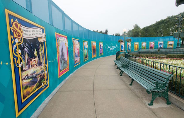 雖然目前尚在城堡擴建期間,但現在城堡範圍都將會建起融合迪士尼多個公主故事的圍板,與樂園的環境互相呼應。在每一面牆上,都描繪了公主故事中最具代表性的場景,更寫上了動畫中經典動人的歌詞,讓迪士尼公主迷們可以搶先身歷其境、重溫感動一下。