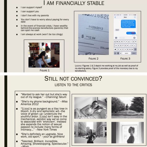 「為何你一定要跟我交往」的PPT完整版,放到推特上之後爆紅,Lizzy都還沒交到男朋友,反而先造成熱烈迴響!她將自己優點分為三大重點,「我是家長都愛的優雅氣質女,比如說感恩節或家庭聚會時,我可以穿著典雅得體出席,懂得餐桌禮儀能,並有絕佳幽默感,能討好您母親歡心。」